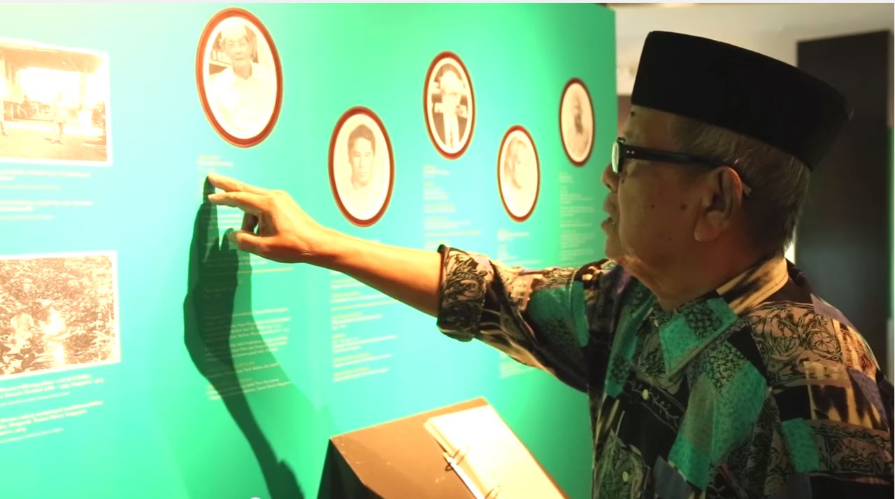 Hj Samsuri pointing to portraits of some of the other Malay Plant Collectors of the Singapore Botanic Gardens in the exhibition Ilham Alam: Nature and Healing in the Malay World organised in 2014 at the Malay Heritage Centre, Singapore