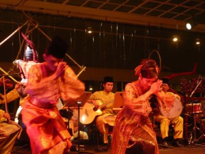 Image captioned “The dancers are doing their sembah or act as respect to the audience to close the performance.” A Singapore dance troupe, performing at the R.Ismail and Elfee Ismail concert at the Esplanade open air stage as part of Pesta Raya 2010, accompanied by the Singapore Malay Orchestra. Image by Nia Nasnani
