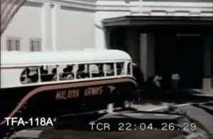 Malayan Airways bus conveying newly-arrived air travelers from Paya Lebar Airport directly to Raffles Hotel.