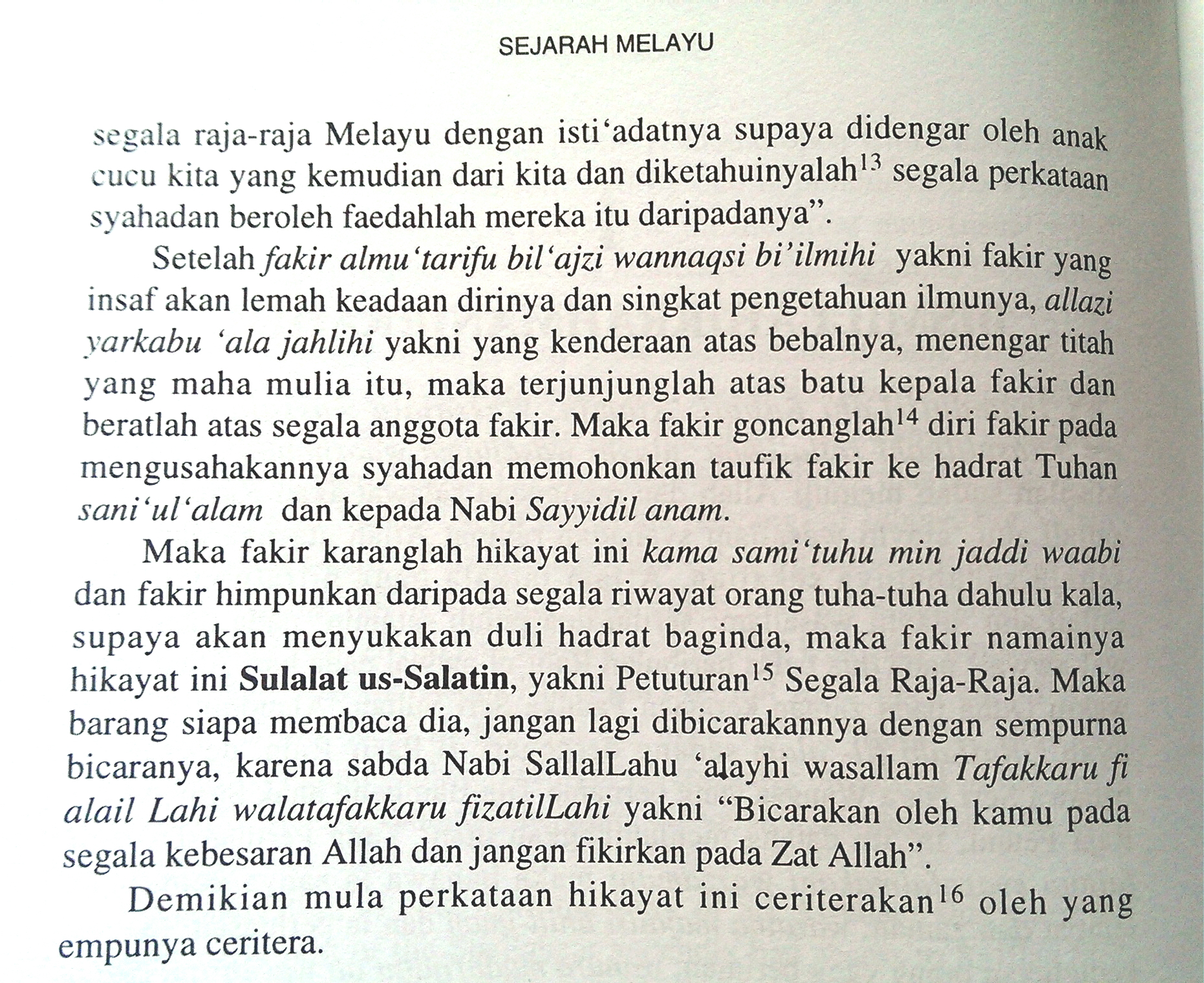 Introduction to the text popularly called “Sejarah Melayu”, in which the author states the title of his work, “Sulalat us-Salatin yakni Petuturan Segala Raja-Raja.”
